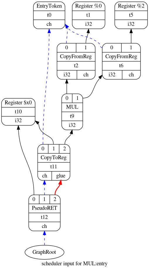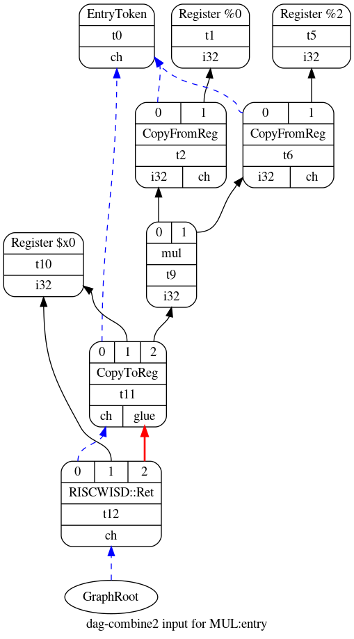 t12: ch = RISCWISD::Ret t11, Register:i32 $x0, t11:1注意:Selection DAG可以同时包含目标独立和目标相关的节点。 目标独立的操作定义在文件ISDOpcodes.h中。 目标相关的操作由每个后端定义,通常定义在声明TargetLowering子类的同一文件中。 您可以在llvm/lib/Target/RISCW/RISCWISelLowering.h中找到目标相关节点的定义。 上面显示的用于MUL的Selection DAG具有节点t12,该节点代表目标相关操作RISCWISD::Ret,该函数表示从函数返回。