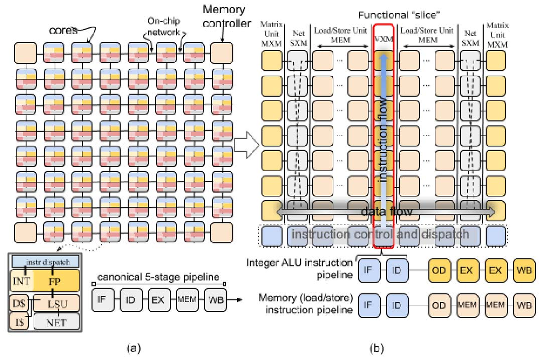 为理解我们方法的新颖性,请看图 1(a) 所示的芯片组织。 在传统芯片多处理器(CMP)[56] [12] 中,每个 “tile” 是一个独立核心,并通过片上网络互联以在核心间交换数据。 指令执行通常分为若干阶段 [46]:1)取指(IF),2)译码(ID),3)ALU 执行(EX),4)内存访问(MEM),5)回写(WB)以更新 GPR。 与传统多核“每个 tile 具备异构功能单元,但整体上同质”的组织方式不同,TSP 反其道而行,形成“局部功能同质、全芯片功能异质”的结构。 TSP 将图 1(a) 中同质的二维核心网格重组为图 1(b) 所示的功能切片微架构。 在该方法中,每个 tile 实现一个特定功能,并在二维片上网格的 Y 维度上垂直堆叠为一个“切片”。 我们按功能拆分图 1(a) 中核心的基本元素:指令控制与派发(ICU)、存储(MEM)、整数(INT)运算、浮点(FPU)运算与网络(NET)接口,对应图 1(b) 顶部的切片标注。 二维片上网格的每一行都包含所有功能切片的一个横截面(见图 2)。 在该组织方式下,每个功能切片由一组与其片上角色相匹配的指令序列独立控制。 例如,MEM 切片支持 Read 与 Write,但不支持 Add 或 Mul,这些仅存在于算术功能切片(VXM 与 MXM)中。 所有同一切片的 tile 执行相同的指令流(SIMD),因此我们可将通用的译码与派发逻辑抽离为独立的 tile(ICU),并将正常的指令执行流水线分为两个部分:(i)取指、译码与分发;(ii)读操作数、执行与回写。 这种方法将内存子系统 [52] 与获取操作数/提交结果的功能单元解耦。 每个功能切片实现一条跨越其所有 tile 的 20 级向量流水线,每个 tile 产生 320 元素最大向量长度中的 16 个元素。 这种组织方式自然地将指令流分解到垂直维度,并将数据流分解到水平维度,使其在不同功能类型上流动。 在该处理器组织下,指令执行由不同 tile 完成:ICU 负责取指与译码,而每个功能切片的各个 tile 负责操作数译码、执行与回写,此时(垂直流动的)派发指令与(水平流动的)操作数数据在交点处完成运算。