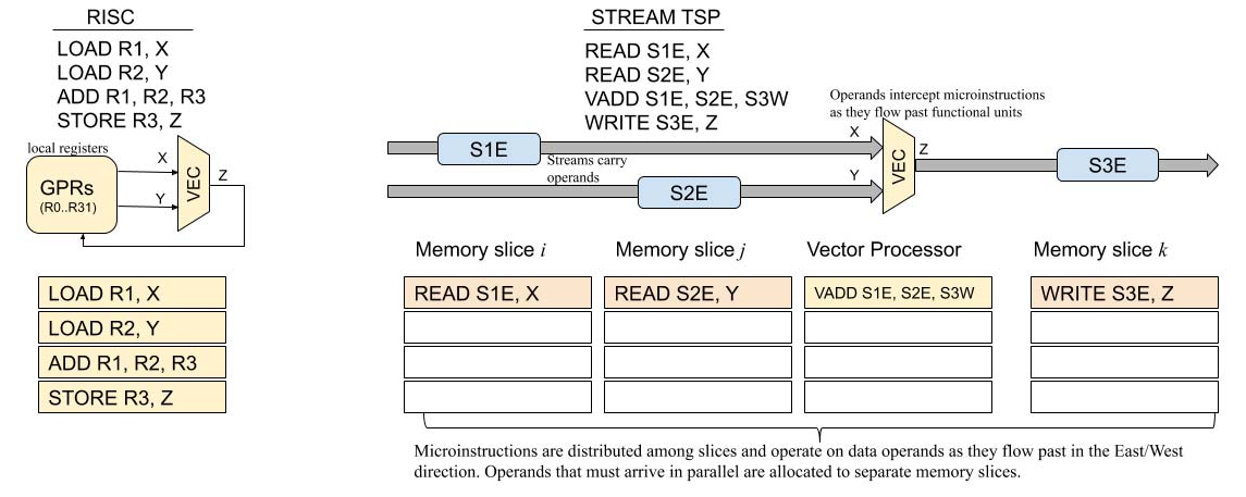 每个切片的 SIMD 执行通过一种称为“并行通道(parallel lanes)”的编程抽象提供数据并行性。 这些并行通道对应数据向量的元素,这是许多机器学习框架(如 TensorFlow [2])中常见的抽象。 在 TSP 模型中,指令从 ICU 向北流向功能切片,而数据(操作数与结果)在功能切片之间向东或向西流动。 向量内部的跨通道数据移动由片上网络(SXM)切片完成。 如图 1 与图 5 所示,片上网络由 X 维与 Y 维的 mesh 构成,并采用 X‑Y‑X 维度顺序路由。 每条指令都会指定第一跳方向(东或西),因此内存指令语义同时包含地址与数据流方向(见图 2)。 流在 X 维通过 MEM 路由,在 Y 维通过 SXM 的置换器与通道移位器进行垂直数据移动。 MEM 与 SXM 在 X 与 Y 维度上提供确定性路由 [16]。 每个流元素是 1 字节,较大数据类型(如 int16、int32、fp32)由多个流组合而成(分别为 2、4、4 个流)。 多字节数据类型总是按照类型大小自然对齐到流上。 数据对齐由编译器完成。 例如,int16 对齐到一对流,int32 对齐到四流组(如 SG4 0 为流 0‑3,SG4 1 为流 4‑7,以此类推)。 在传统 load-store 架构中,通用寄存器(GPR)为 ALU 操作数提供快速访问并存放 ALU 输出。 例如,对两个 N 元素向量 X 与 Y 求和得到 Z(见图 3)。 在该例中,RISC 核心需要循环四条指令执行逐元素加法:Add R1,R2,R3 之前必须先 LOAD R1,X 与 LOAD R2,Y 将操作数搬入 GPR,且 R3 中结果必须用 STORE R3,Z 回写到主存。 在 TSP 架构中,功能切片以生产者‑消费者方式与数据流交互。 也就是说,它们从流中消费操作数,并把结果产生到(可能不同的)流上,类似装配线工位(功能切片)与传送带(流)。 概念上,功能切片固定,数据在其处理单元上流动,如图 2 所示。 当数据流经切片时,每个功能单元可以选择性地截取操作数并计算结果(如果它是 ALU 之类的处理单元),或在网络中移动通道间的数据(如果它是交换单元)。 流提供一种编程抽象,是数据在功能切片之间流动的通道。 与 GPR 不同,功能切片操作的是在芯片上向东或向西流动的并行数据流。 水平流动的操作数流与垂直(向北)流动的指令相交(见图 2),在某个功能切片上完成计算。 编译器精确跟踪芯片的体系结构状态,并利用该知识确保指令正确地截获其流操作数。 流在硬件中由全芯片的流寄存器文件(SR)实现。 它们对体系结构可见,用于在切片之间传递操作数与结果。 一种常见的软件模式是:从一个或多个 MEM 切片读取操作数数据,随后由下游算术切片消费并运算。 运算结果产生到另一个流上,使其能够写回内存。 例如,Z=X+Y 可能需要四条指令:在两个 MEM 切片上执行 Read S1,X 与 Read S2,Y,并将其朝芯片中部送往 INT 切片以执行 Add S1,S2,S3。 最后,结果通过 Write S3,Z 写回内存。 这些流表示一个包含 N 个元素的集合,由每个功能切片以 SIMD 方式操作。