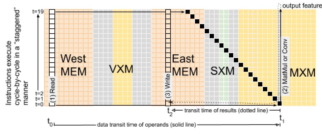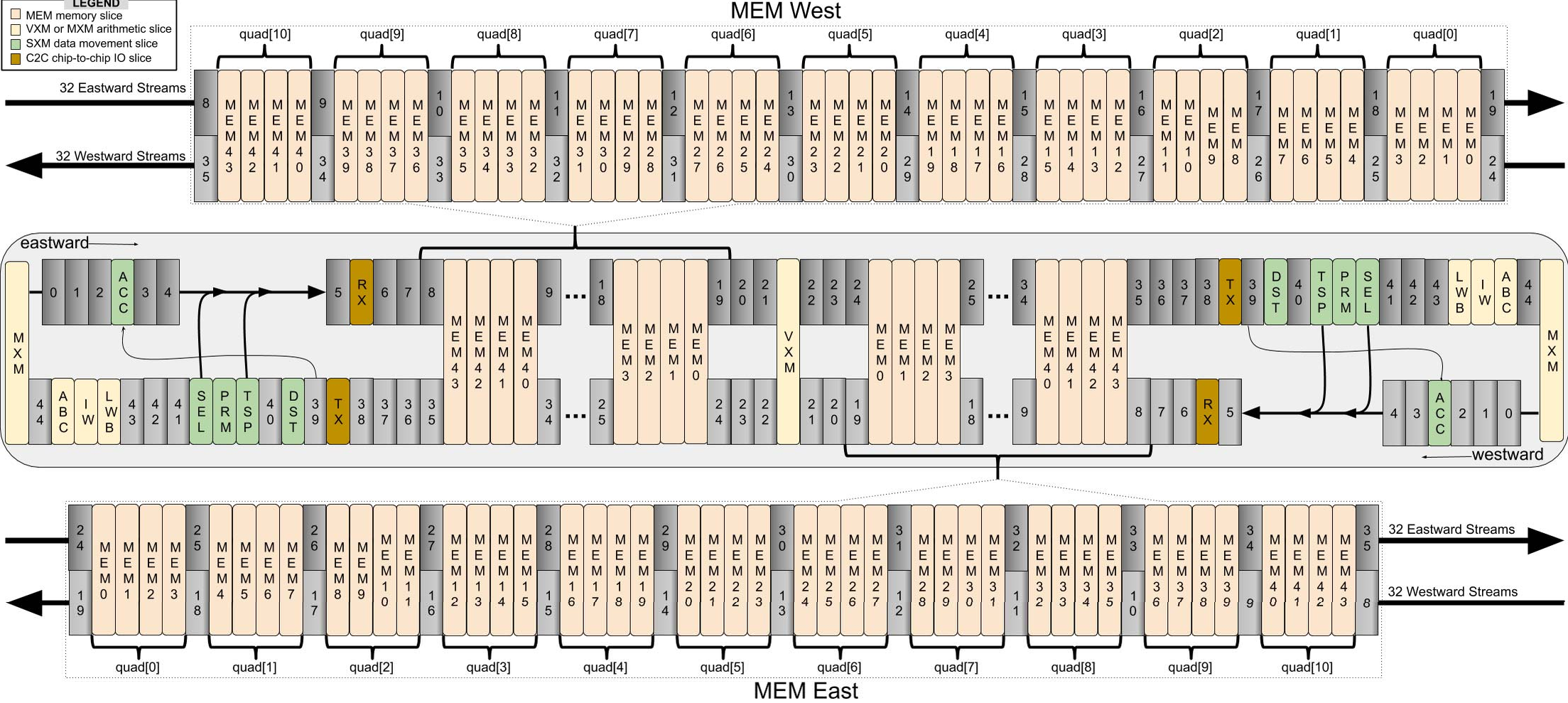 c)片上网络: 传统片上通信通常通过在核心之间路由分组 [19] 完成,分组经历路由、仲裁与输出端口调度,容易产生冲突,从而引入非确定性并需要流控 [16], [17]。 然而,在 TSP 中,每个核心时钟周期,流值按其流动方向在流寄存器之间前进一个 hop(见图 4)。 TSP 硬件不跟踪源或目的切片,流只是向东或向西传播,直到从芯片边缘流出或被某个功能切片覆盖。 与这种更传统的片上网络相对,TSP 使用每个 MEM 中的流寄存器(见图 4 的编号)在 X 维度(superlane)移动数据,并使用 SXM 在 Y 维度通过通道置换移动数据。