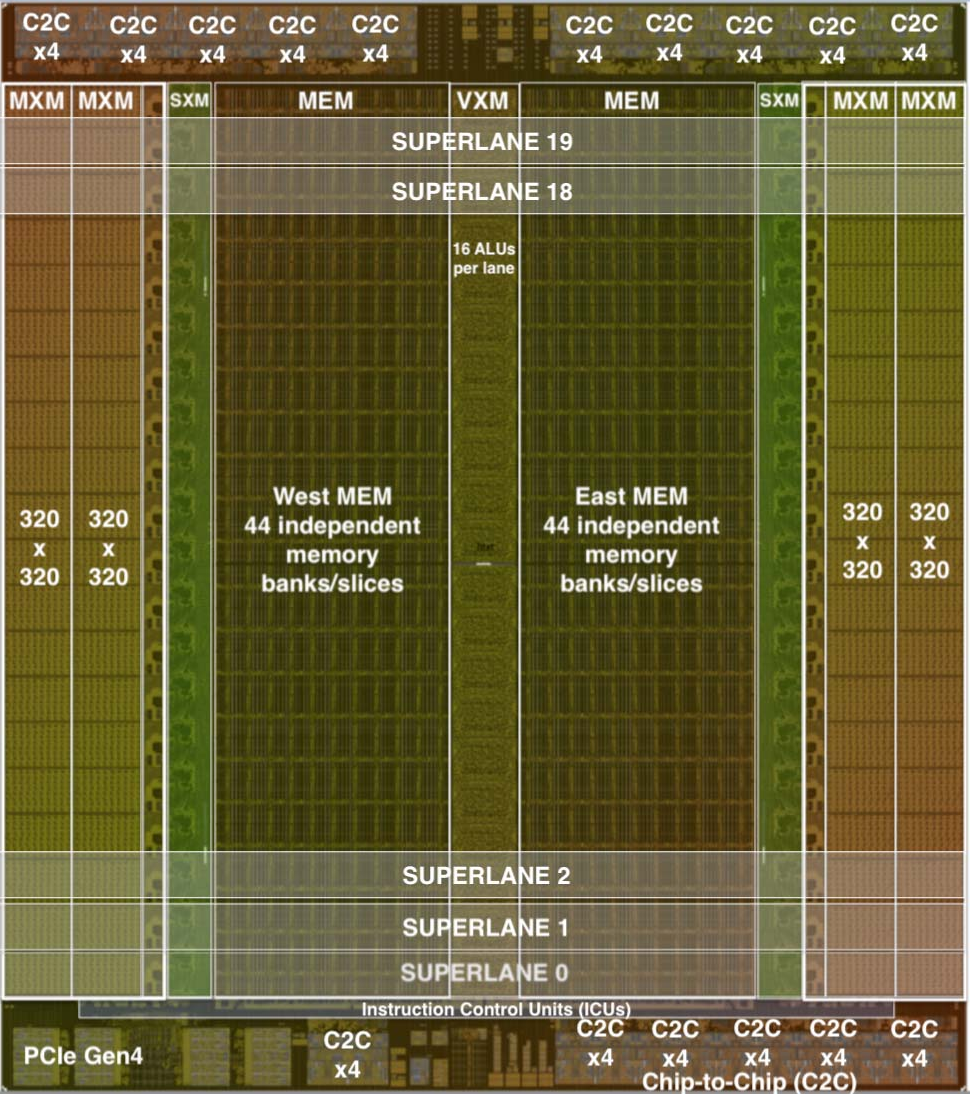 - 我们将这 16 通道单元称为“超级通道(superlane)”,它是芯片上所有功能切片的横截面,也是计算的最小粒度。