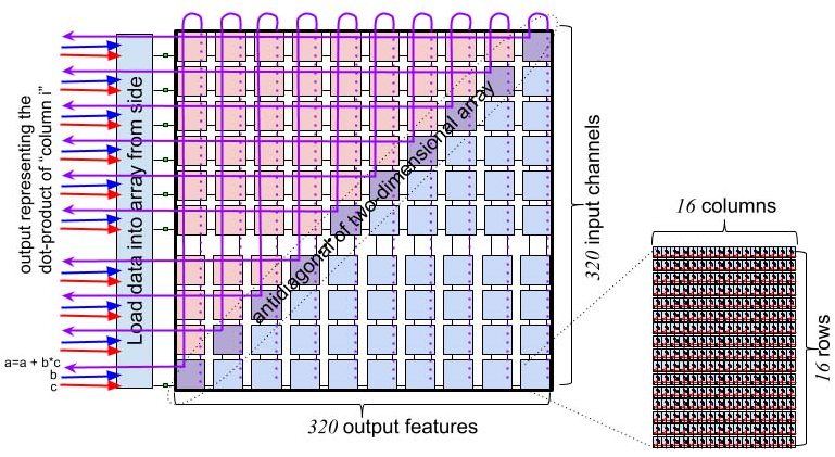 - 例如,MEM 能在不到 40 个周期内(包含 SRAM 与片上网络传输延迟)读出并由 MXM 安装 40 万个权重到四个 320×320 阵列中。