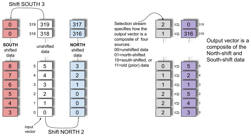 交换执行模块(SXM)包含若干用于转置、置换、移位与旋转数据元素的功能。 这些操作用于执行 ML 工作负载常见的张量重排,并实现图 1 中 NET 切片的功能。 片上数据移动在二维上路由:在 X 维度上水平传播流,在每个 superlane 内在 SRAM 与功能单元之间穿梭;在 Y 维度上通过 SXM 将流在南北方向移动。 SXM 提供两组通道移位器,可在南北方向执行移位指令(见图 8)。 通道移位器通常成对使用,因为我们通常需要将向量上移或下移,并在(i)北向移位、(ii)南向移位、(iii)未移位的数据中进行选择,如图 8 详示。 此外,SXM 提供置换指令,通过编程的双射映射重排 320 个通道在一组同索引流上的位置,每个 superlane 一条流。 SXM 内的 distributor 切片用于在每个 superlane 内任意重排 16 个通道。 流经过 distributor 时,可在满带宽下重新映射,或将任意元素置零。 这为零填充或重排 4×4 滤波器元素等常见张量操作提供了高效机制。 转置张量维度是张量数据类型中的常见操作。 TSP 支持对 256 个元素进行二维转置,这些元素组织为 16 条流、每条 16 个元素。 转置操作将 16 条输入流变为 16 条输出流,并交换行与列。 这使我们能够将原子 16 字节 MEM 字高效地分布到 16 条不同 MEM 切片中,从而可被寻址。 片上有两个 SXM 实例,分别位于两个半区(见图 5)。 每个实例可发出两条转置指令,因此最多可同时执行四个 16×16 转置。