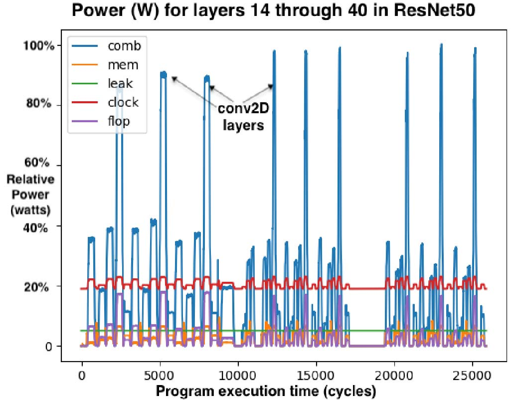 本节介绍我们在 TSP 硬件上实现 ResNet50 [27] 的早期结果与经验。 在新硬件 bring‑up 过程中,软件栈至关重要,因为它要将底层张量操作映射到实现它们的 TSP 指令集。 编译器还负责张量(权重与激活)以及描述模型本身的程序文本的内存管理。 MEM 系统为编译器提供了扁平、全局共享的地址空间,总容量 220 MiB。 作为策略,编译器会预留若干 MEM 切片作为“指令派发”切片,用于存放机器码指令,并通过流供不同功能切片的 Ifetch 使用,最终在这些切片上执行。 总体目标上,模型实现希望最大化功能切片利用率并最小化延迟。 这意味着尽可能利用将操作数流式送入 MXM 与 VXM 的方式。 四个 320×320 的 MXM 平面用于矩阵乘法。 每通道的 16 个向量 ALU 负责对 MXM 的 int32 输出进行重新量化,产生 int8 结果,并通过 ReLU [8] 激活函数流式输出。 从性能与功耗角度看,当可能时我们希望将一个功能切片(如 MXM)的结果直接链到另一个功能切片(如 VXM)的输入,避免将中间结果读写到 MEM。 图 10 展示了程序逐层执行时的功耗变化。 功耗峰值对应我们同时执行四个 conv2d 操作、使 TSP 算术吞吐达到饱和的周期。