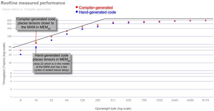 a)运行区间: 图 9 的屋顶线图 [57] 为理解芯片不同运行区间提供直观框架,其性能受限于(i)片上内存带宽或(ii)算术性能,二者由图中斜率峰值分界。 斜率区域表示 TSP 在为后续 conv2D 或 MatMul 装载权重到 MXM 阵列时变为内存带宽受限。 “屋顶线峰值”表示算术单元达到峰值利用率并受算术性能限制的点。