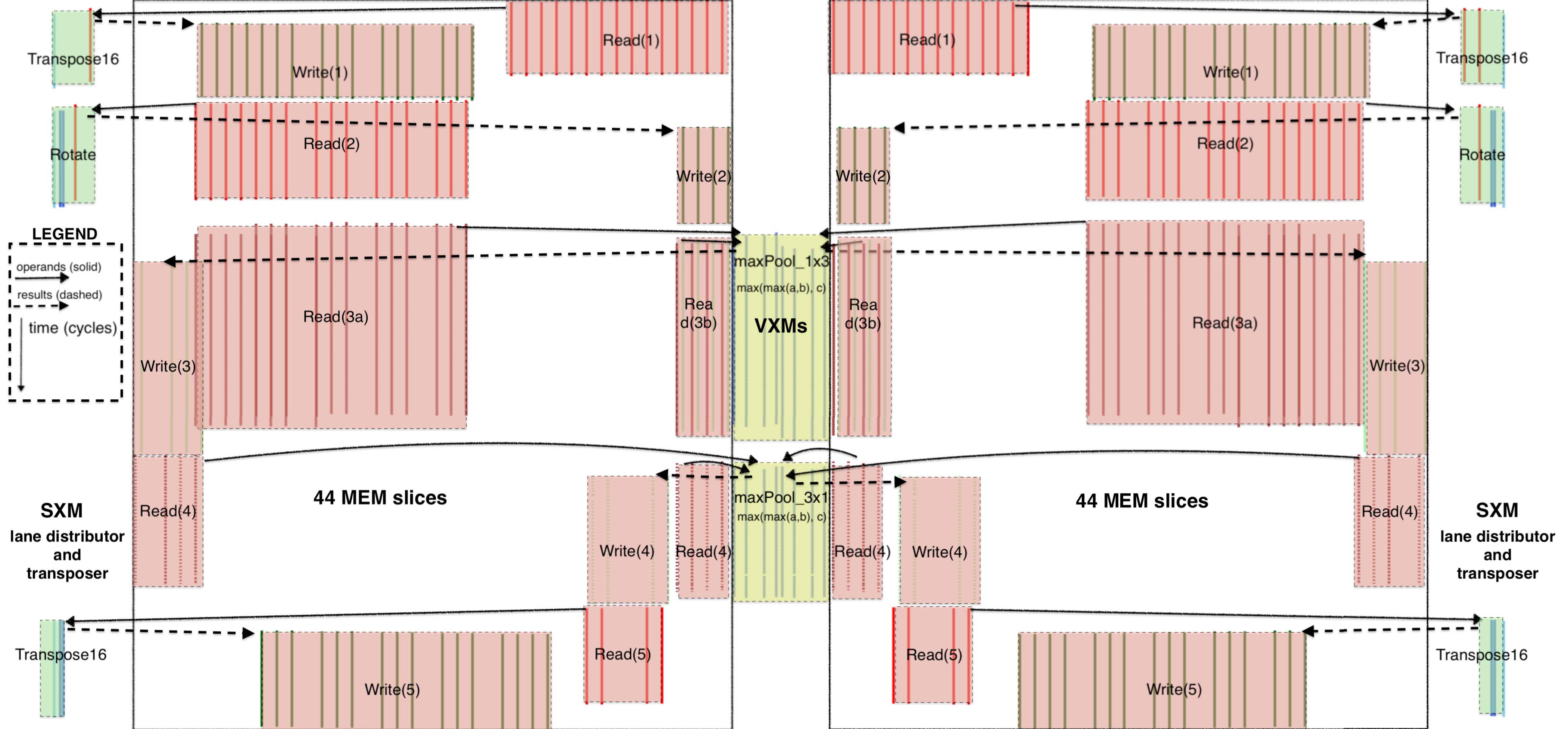 这相当于 55 TiB/s 的片上内存带宽,或每个半区 27.5 TiB/s 的 SRAM 带宽。 取指(见第 III‑A3 节)最多消耗 144×16 = 2.25 TiB/s 的 SRAM 带宽。 每个 MEM 半区从其 27.5 TiB/s 的 SRAM 带宽中输出 20 TiB/s 的流带宽,还需满足跨所有功能切片的 2.25 TiB/s 最大发射速率。 在 27.5 TiB/s 的 SRAM 带宽与 2.25 TiB/s 的取指带宽后,仍有 25 TiB/s 的 SRAM 带宽可用于为操作数与结果提供 20 TiB/s 的流寄存器带宽。